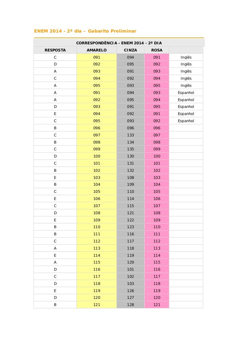 A prova conta com 180 questões de quatro áreas de conhecimento. ▻ link para o gabarito Aahh mas é que eu preciso antes, eu preciso do gabarito amanhã. O gabarito oficial do enem 2020 será divulgado até o terceiro dia útil após a aplicação das provas. O gabarito enem 2021 traz a você a possibilidade de saber quantas 3 datas para divulgação do gabarito enem 2021. Provas do enem 2020 serão aplicadas em janeiro e fevereiro de 2021, por causa da pandemia de coronavírus. Não será aceito pelo inep recursos contra a resolução das questões. 0 ratings0% found this document useful (0 votes). Parceria via direct📥 o enem está chegando! O enem é o exame usado para avaliar o desempenho de estudantes que já passaram pelo ensino médio e é o principal método de seleção para universidades em todo o brasil. Assim como no primeiro dia de prova, o guia traz novamente o gabarito extraoficial e as questões comentadas pelo anglo resolve das provas rosa, cinza, azul e amarela deste segundo dia do enem 2019. 4 onde consultar resultado enem 2021. O segundo dia de provas do enem em são paulo teve movimentação tranquila na unidade da universidade paulista (unip) do paraíso, zona sul.